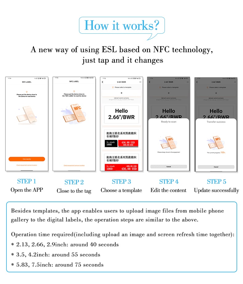 휴대폰 NFC로 리프레쉬가 가능한 디지털 라벨입니다. 소매점, 사무실, 공공 장소 등을 포함하여 더 많은 애플리케이션 시나리오에 전자 종이 스크린의 진입을 가속화합니다.